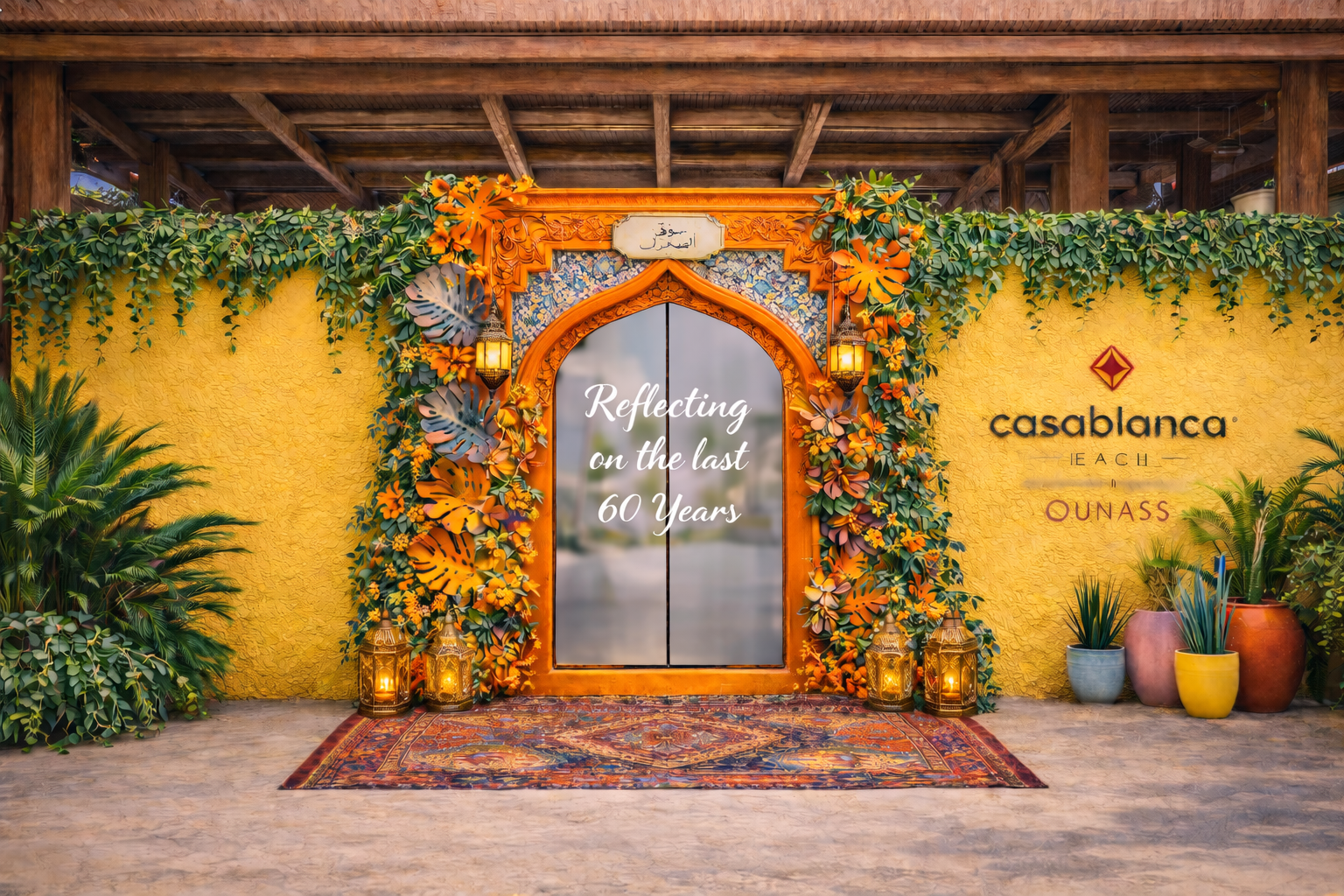 As guests open the mirrored door and step through the frame, the installation transforms into a symbolic threshold—marking the transition from past to present, reflection to celebration. Soft floral accents adorning the frame echo the pastel tones of Casablanca Beach Club, adding warmth and elegance without overpowering the design. The result is a striking, meaningful entrance that functions as art, storytelling, and experience all at once - creating an unforgettable sense of arrival worthy of such a landmark anniversary.