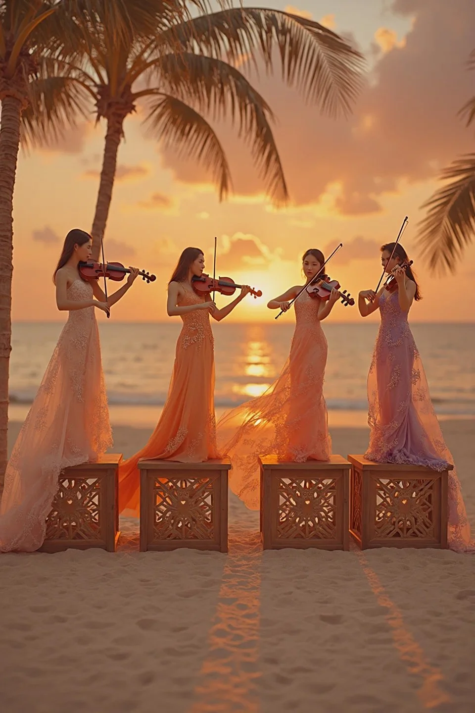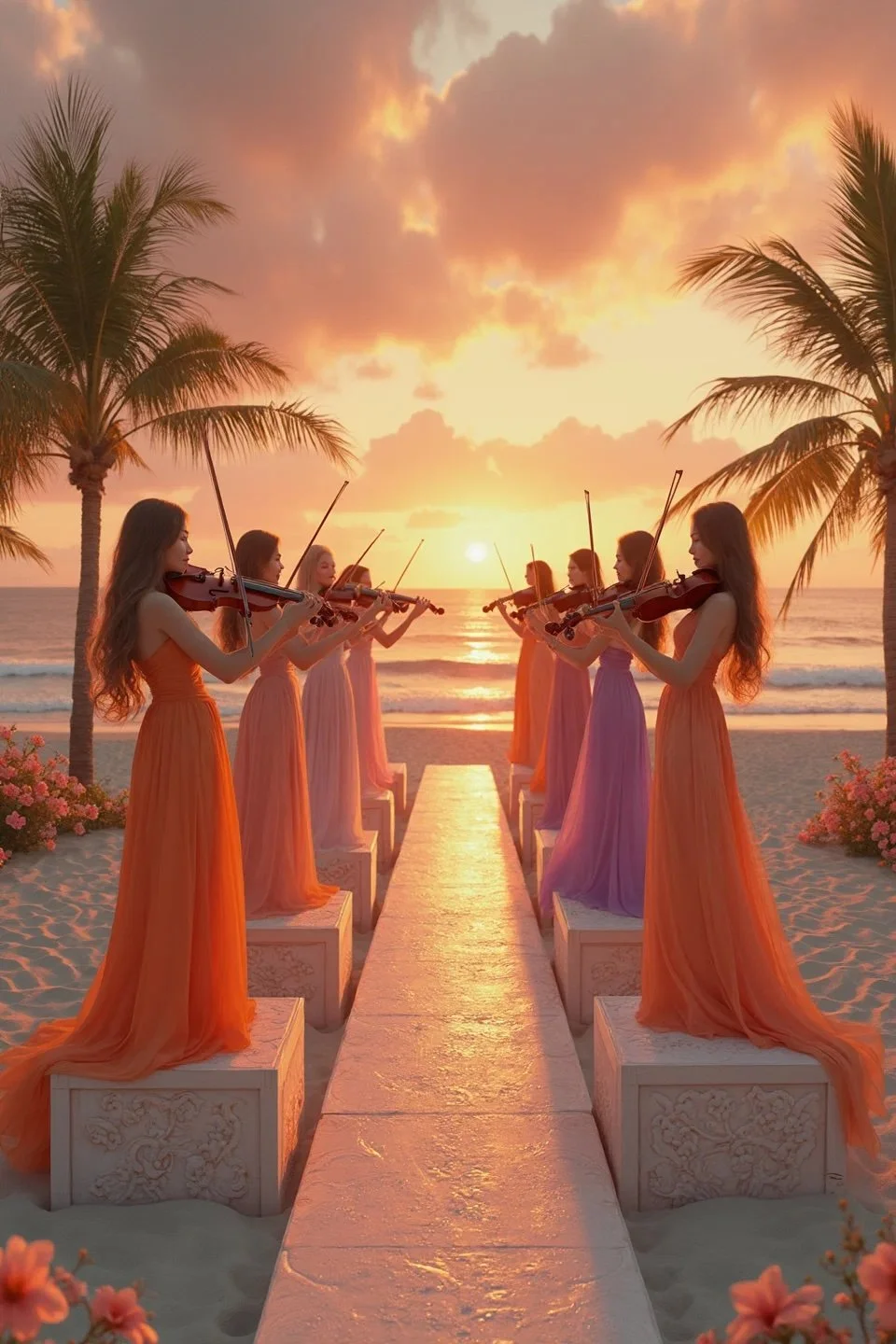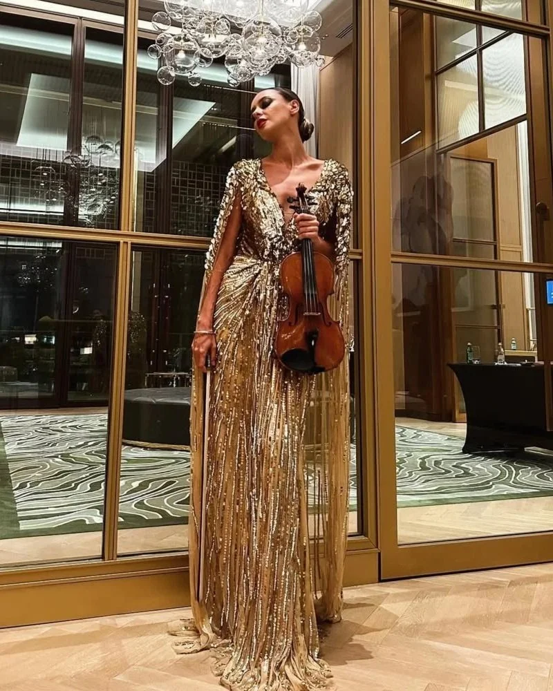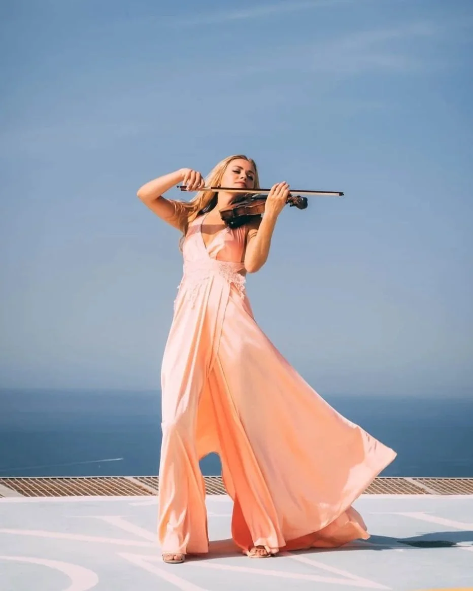 After stepping through the archway, guests enter a musical welcome walkway designed to heighten anticipation and immerse them fully into the Sunset Soirée atmosphere. Along the pathway, rows of violinists stand elevated on sleek sunset-lit podiums, creating a striking visual corridor of music and movement. Their modern, cinematic arrangements drift through the air, harmonising with the colours of the sky and the gentle roll of the ocean. The elevated performers not only frame the walkway but create a sense of grandeur and celebration, guiding guests forward with both sound and spectacle. It is a transitional moment that feels curated, intimate, and unmistakably special – a living overture to the night ahead.