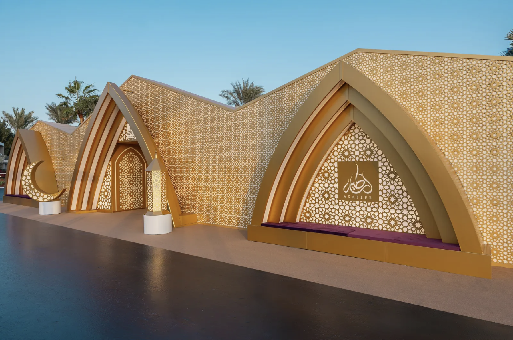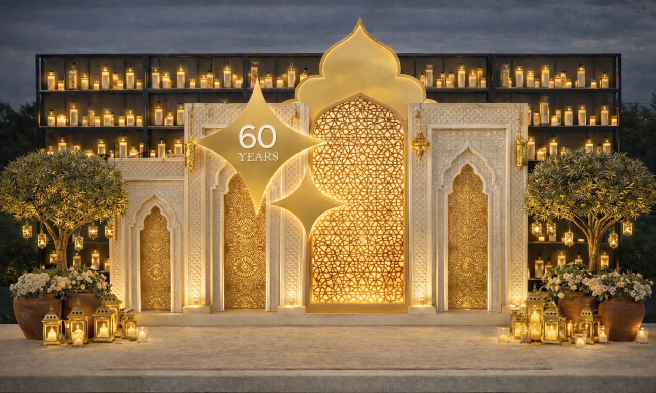 Within the Asateer tent, a beautifully styled Arabesque Photozone will offer guests a moment to pause, capture memories, and fully immerse themselves in the rich Middle Eastern atmosphere of the evening. Inspired by traditional architectural arches and intricate geometric detailing, the installation blends warm golden tones, ornate patterns, and soft ambient candlelight to create a space that feels both luxurious and culturally evocative. Layered textures — from sculptural panels and elegant drapery to lush floral accents and lantern-lined surroundings — frame the setting, while subtle anniversary branding adds a refined celebratory touch. Designed as both a striking visual focal point and an inviting guest experience, this photozone becomes a natural gathering point where storytelling, heritage, and celebration come together seamlessly.
