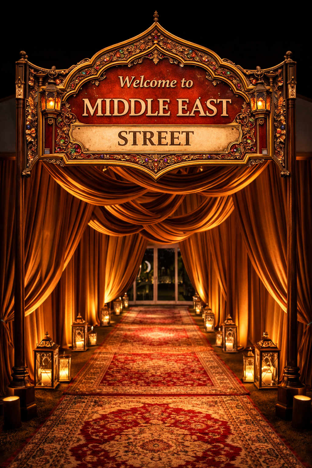 Guests arrive through an opulent Arabian-inspired entrance, draped in rich fabrics and illuminated by the warm flicker of golden lanterns. Ornate arches, patterned screens, and luxe candlelit pathways guide them into the celebration, creating an immediate sense of grandeur and mystery. Lush palms, intricate metal lanterns, and deep jewel-toned accents frame the walkway, transporting guests into a world of timeless elegance from the moment they step inside. The atmosphere feels inviting yet majestic — a true prelude to a spectacular 60th anniversary gala.
