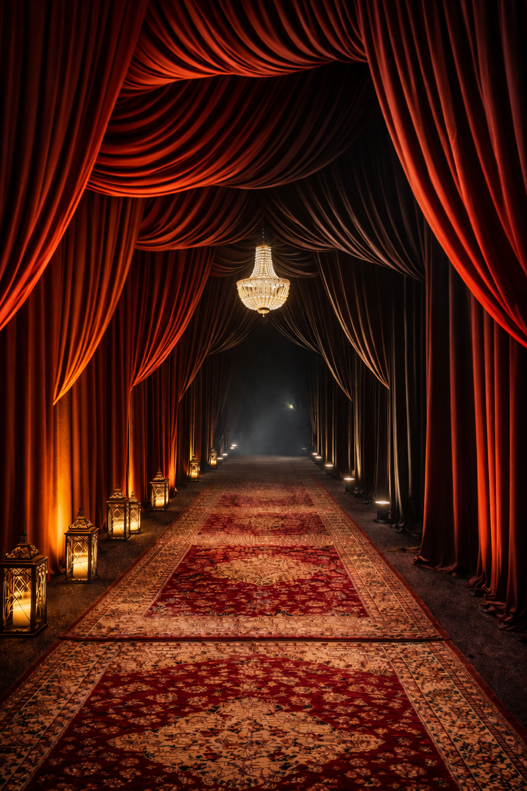 As the immersive energy of the Asateer tent reaches its crescendo, guests are gently guided into a transitional walkway designed to shift the mood from vibrant Middle Eastern spectacle to refined gala elegance. Rich red drapery marks the final moments of the sensory journey, gradually giving way to sleek black textures — a visual cue that signals the evolution of the evening. This passage becomes a symbolic threshold, allowing guests to move seamlessly from an intense, theatrical welcome into the sophisticated world that awaits beyond.