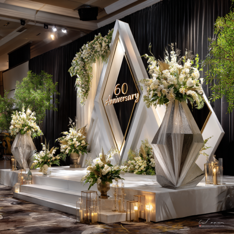 The Black Diamond Photozone will serve as a striking visual centrepiece within the gala, designed to capture the elegance and prestige of the 60th anniversary celebration. Inspired by sculptural diamond forms and refined monochrome styling, the space will feature layered geometric backdrops in black, white, and soft metallic accents, complemented by lush floral arrangements and touches of natural greenery. Elevated platforms, candlelight details, and clean architectural lines create a sophisticated environment that feels both modern and timeless — inviting guests to pause, celebrate, and capture beautifully curated moments. More than a simple photo opportunity, the installation becomes an immersive design statement, reflecting the glamour of the Black Diamond concept while offering a memorable and shareable highlight of the evening.