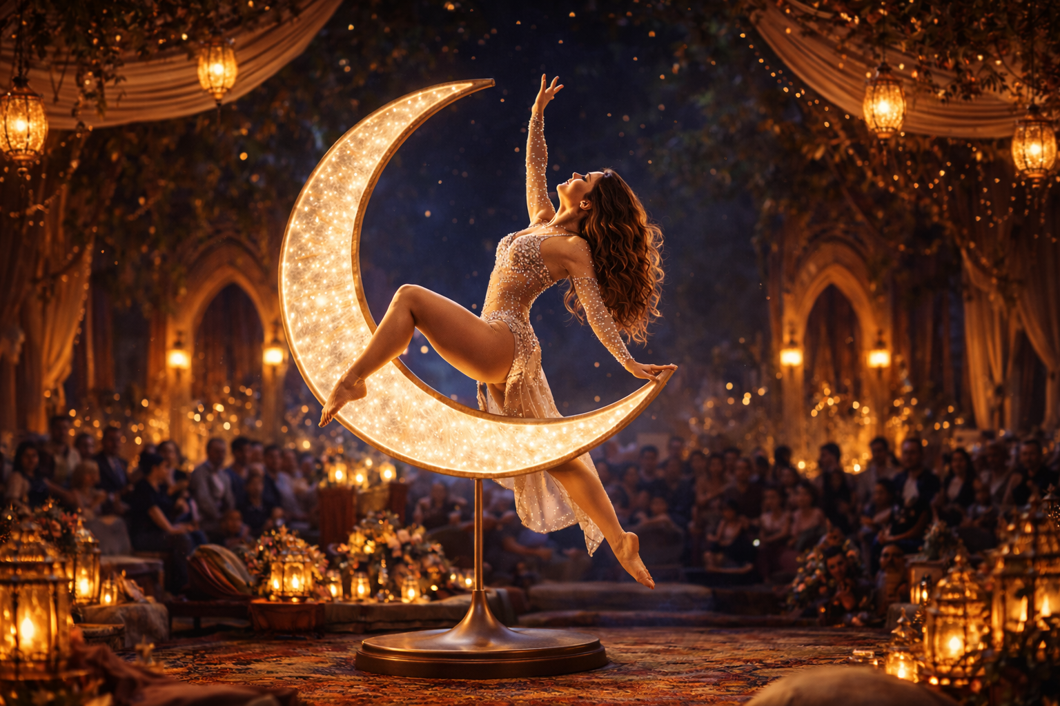 Our Moon Acrobat brings celestial elegance to your event, performing within a beautifully crafted crescent-moon frame positioned on the ground as a striking visual centrepiece. With graceful strength and fluid choreography, the aerialist moves effortlessly through the sculptural arc, creating captivating silhouettes and dreamlike poses that enchant audiences from every angle. The combination of refined movement and elegant staging transforms the performance into a poetic, ethereal spectacle—perfect for gala dinners, luxury soirées, and atmospheric moments that call for sophistication and wonder.