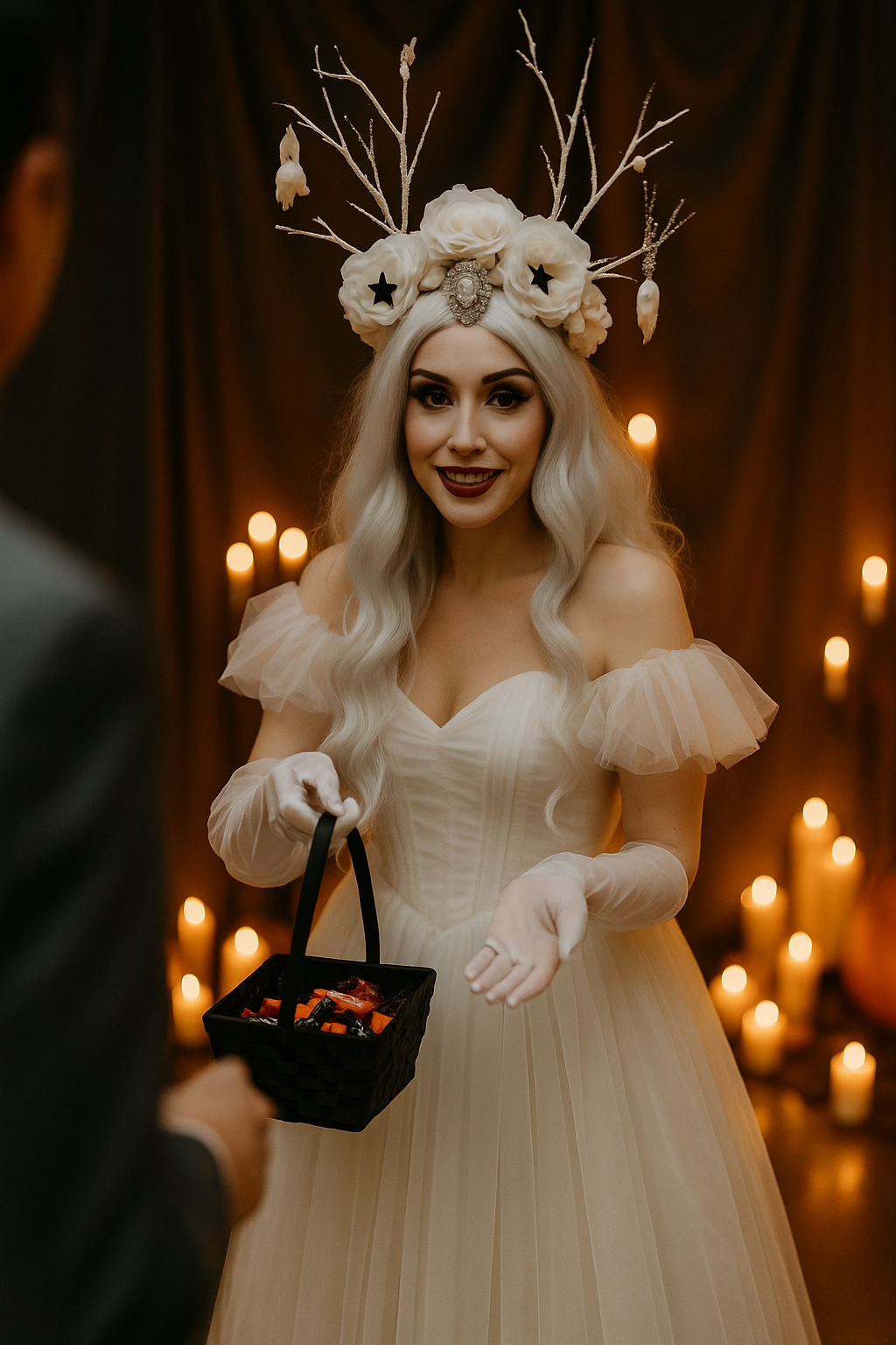 Floating through the venue in a billowing white ballgown, crowned with a bespoke shimmering headdress, the Glam Ghost is an ethereal host who is equal parts glamour, wit, and mystery. They roam silently at times, drifting gracefully as if haunting the space, then break the stillness with cheeky one-liners and playful interactions that bring the character to life.