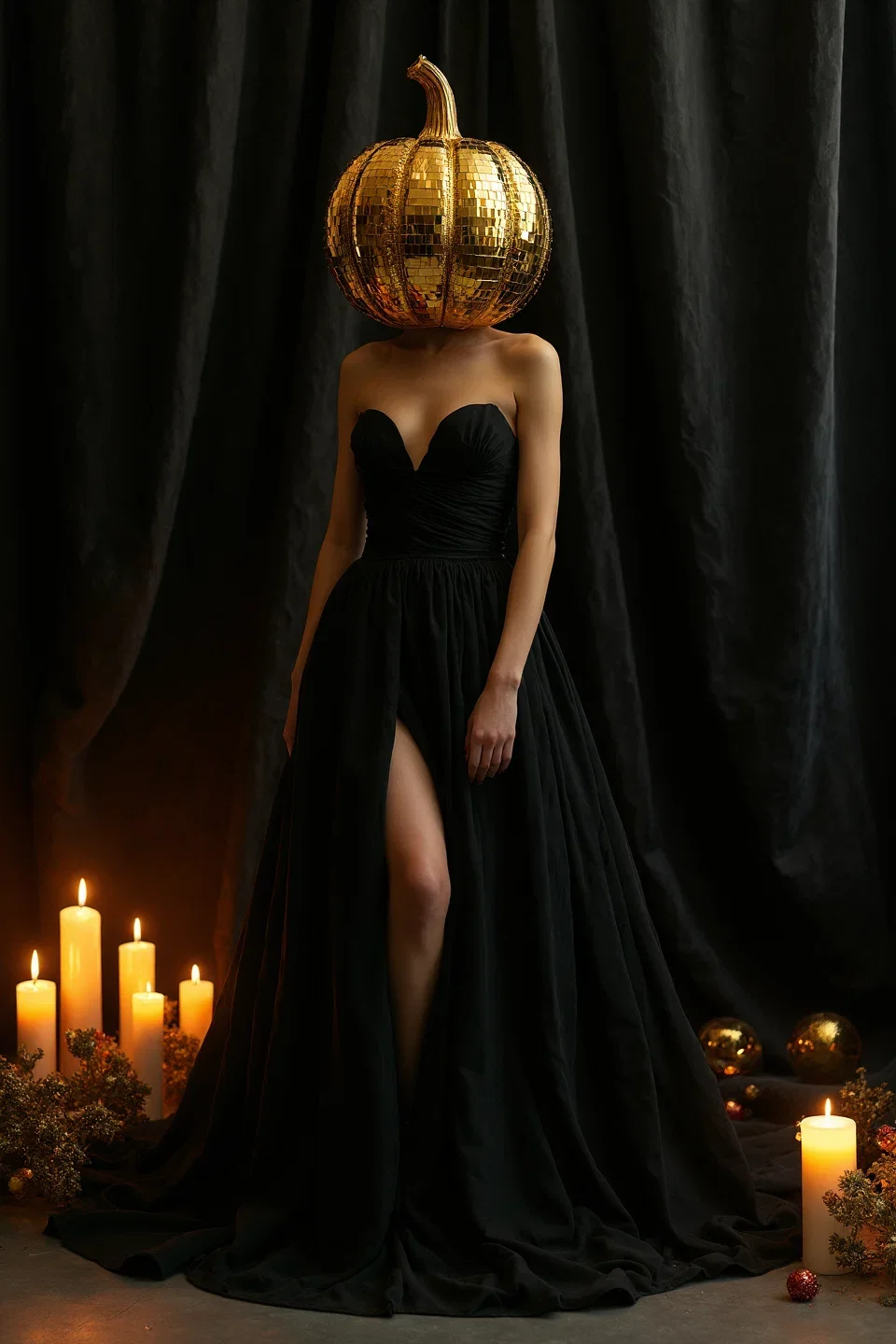 As the soundscape surrounds them, guests encounter two striking Gold Glam Disco Pumpkin Head Models, dressed in flowing black ballgowns. These professional dancers (performers in disguise) move silently yet gracefully, using expressive body language to guide guests into the event. Their shimmering disco-pumpkin heads reflect candlelight and ambient effects, creating a surreal, mesmerising welcome.