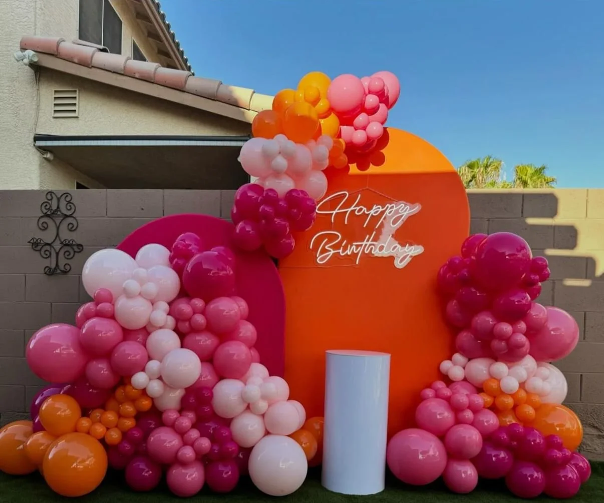 For a more playful yet refined statement piece, we propose a bespoke balloon arch and custom board backdrop, reimagined to suit the luxury sunset theme. This design draws inspiration from the curved, organic shapes often seen at high-end private events, elevated through the use of premium matte and metallic balloons in rich sunset tones of blue, orange, and pink, complemented by touches of gold. The backdrop board would feature sleek branding or event insignia, subtly illuminated to catch the warm lighting of the room. Together, the sculpted arch and board create an elegant focal point—maintaining a chic, polished aesthetic that aligns perfectly with the overall ambience of the awards ceremony.